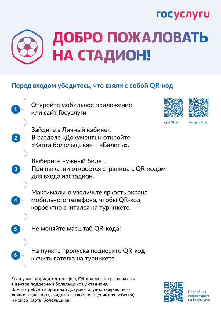 Карта болельщика используется при покупке билетов и абонементов, которые автоматически появятся в личном кабинете в специальном разделе. При входе на стадион достаточно будет отсканировать QR-код выбранного билета на Госуслугах, не предъявляя никаких дополнительных документов.