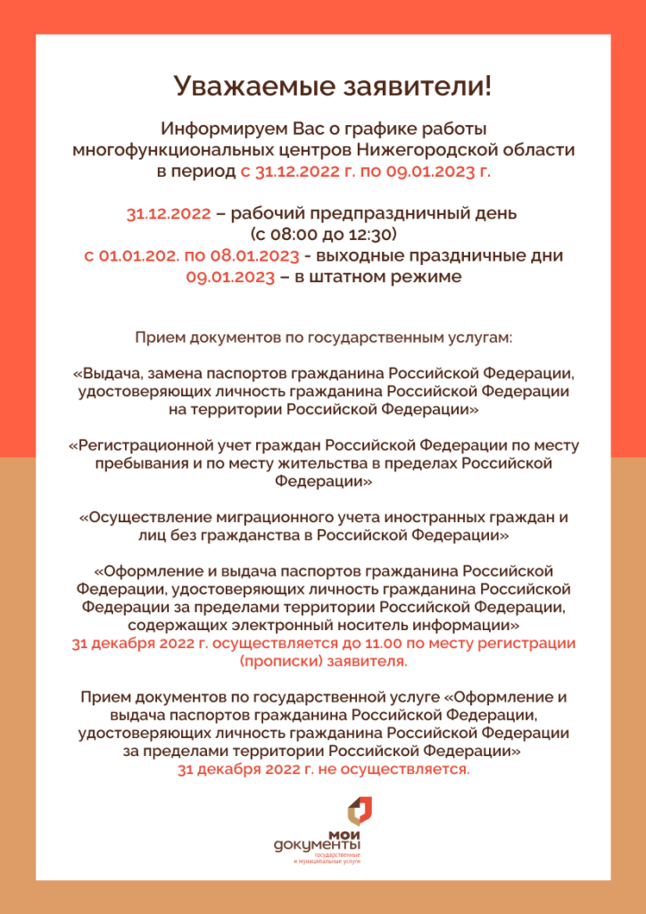 График работы МФЦ с 31.12.2022 по 09.01.2023