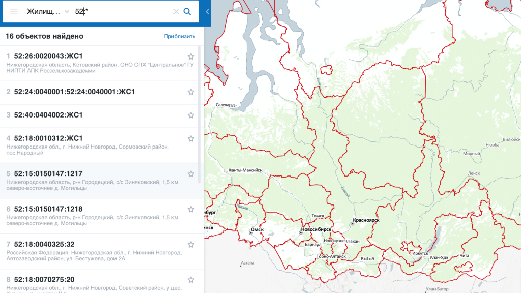 • выполнить поиск по кадастровому номеру или по условному номеру* (*для поиска всех объектов необходимо ввести символ «*» в строку поиска.)