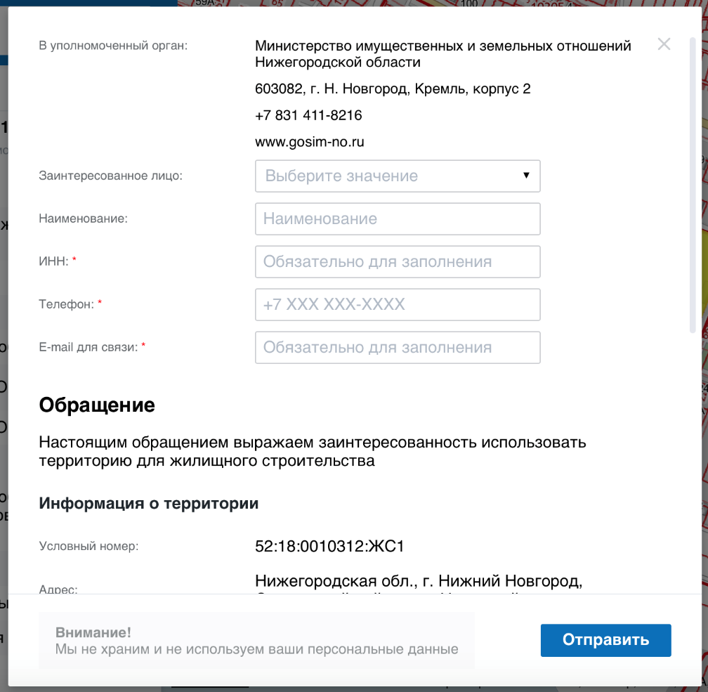 Сервис позволяет обеспечить связь между органами исполнительной власти, органами местного самоуправления и заинтересованными лицами. Потенциальные инвесторы смогут заполнить форму обращения, связанного с конкретным объектом, и отправить его в уполномоченный орган.