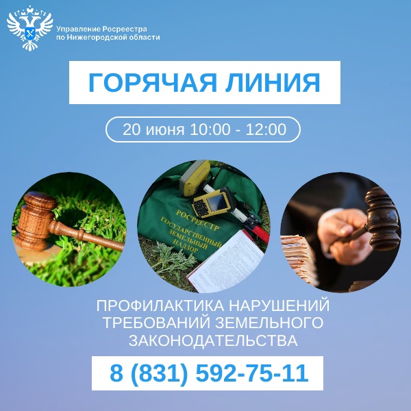 20 июня с 10:00 до 12:00 по телефону 8 (831) 592-75-11 специалисты Нижегородского Росреестра проведут «горячую линию» по вопросам земельного законодательства.