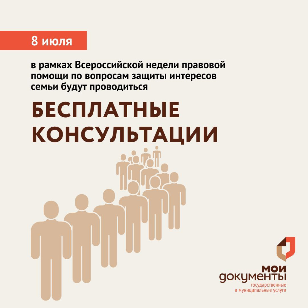 08 июля в рамках Всероссийской недели правовой помощи по вопросам защиты интересов семьи будет проводится консультация граждан во всех отделениях МФЦ города Нижнего Новгорода.
